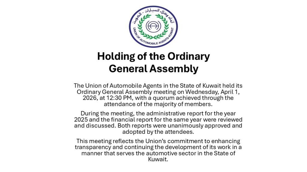The Union of Automobile Agents in the State of Kuwait held its Ordinary General Assembly meeting on Wednesday, April 1, 2026, at 12:30 PM, with a quorum achieved through the attendance of the majority of members.